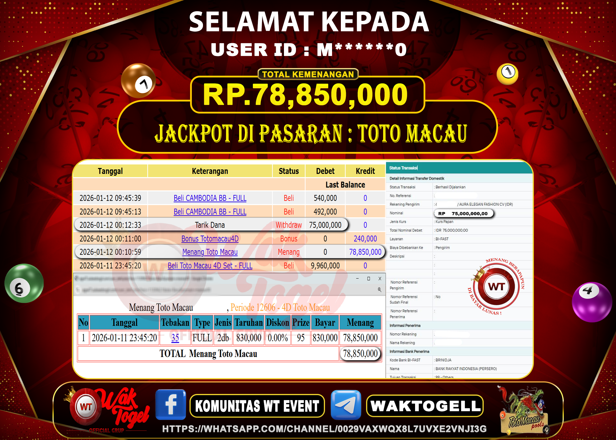 BUKTI PEMBAYARAN TOTO MACAU WAKTOGEL BUKTI PEMBAYARAN TOTO MACAU WAKTOGEL RP. 78,850,000 – GAME : TOGEL TOTO MACAU POOLS (USER ID : M******0) TANGGAL |12-01-2026| […]