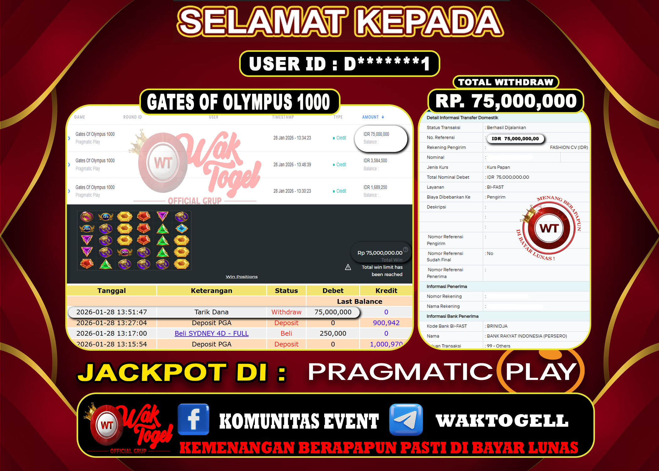 JACKPOT SLOT WAKTOGEL BUKTI PEMBAYARAN SLOT WAKTOGEL By JPWT Januari 28, 2026 0 comments 2 min read BUKTI PEMBAYARAN SLOT WAKTOGEL BUKTI PEMBAYARAN SLOT WAKTOGEL RP. 75,000,000 – GAME : SLOT GATES OF OLYMPUS 1000 (USER ID : D*******1) TANGGAL |88-01-2026| CASH […]
