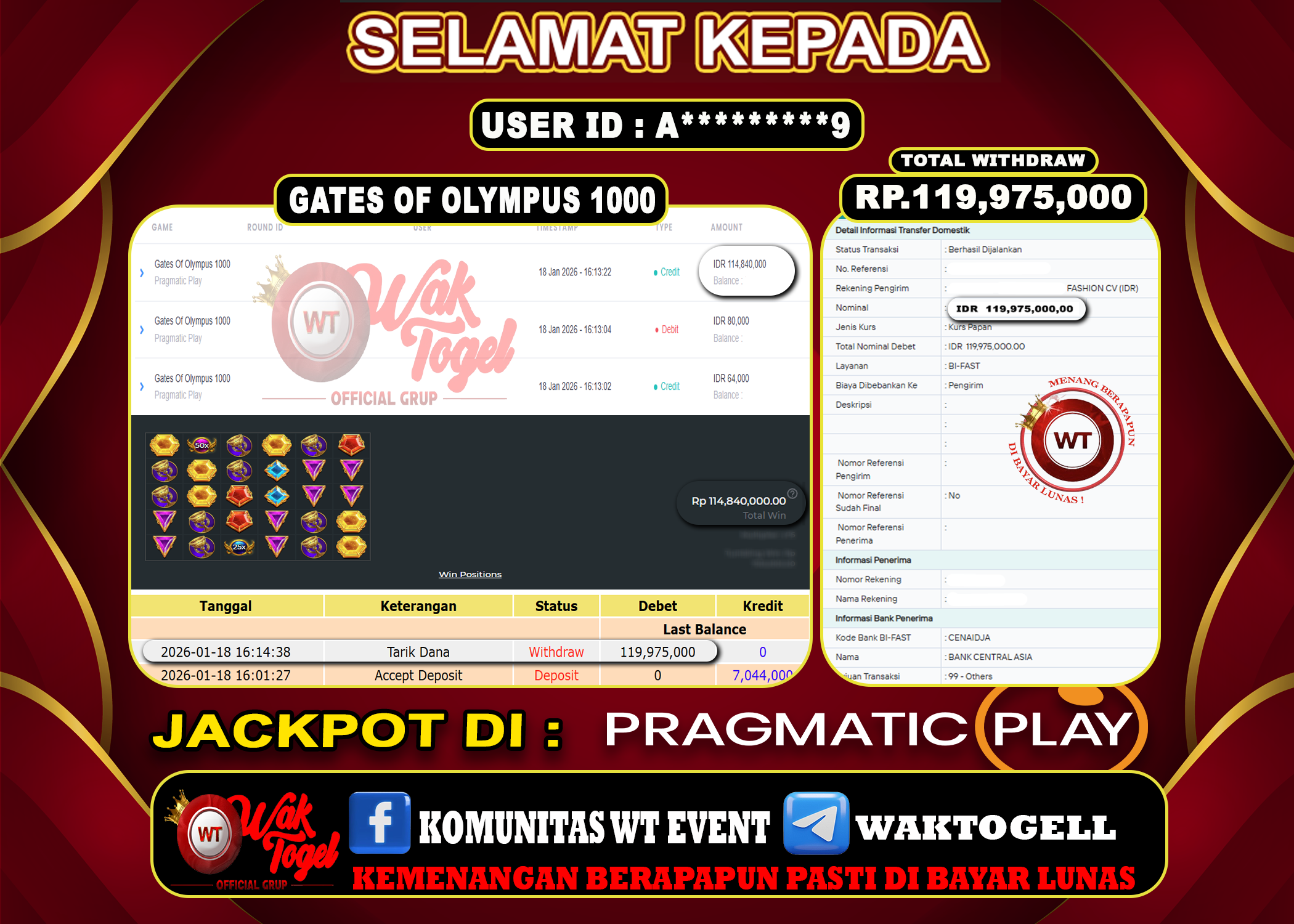 JACKPOT SLOT WAKTOGEL BUKTI PEMBAYARAN SLOT WAKTOGEL By JPWT Januari 19, 2026 0 comments 2 min read BUKTI PEMBAYARAN SLOT WAKTOGEL BUKTI PEMBAYARAN SLOT WAKTOGEL RP. 119,975,000 – GAME : SLOT GATES OF OLYMPUS 1000 (USER ID : A********9) TANGGAL |18-01-2026| CASH […]