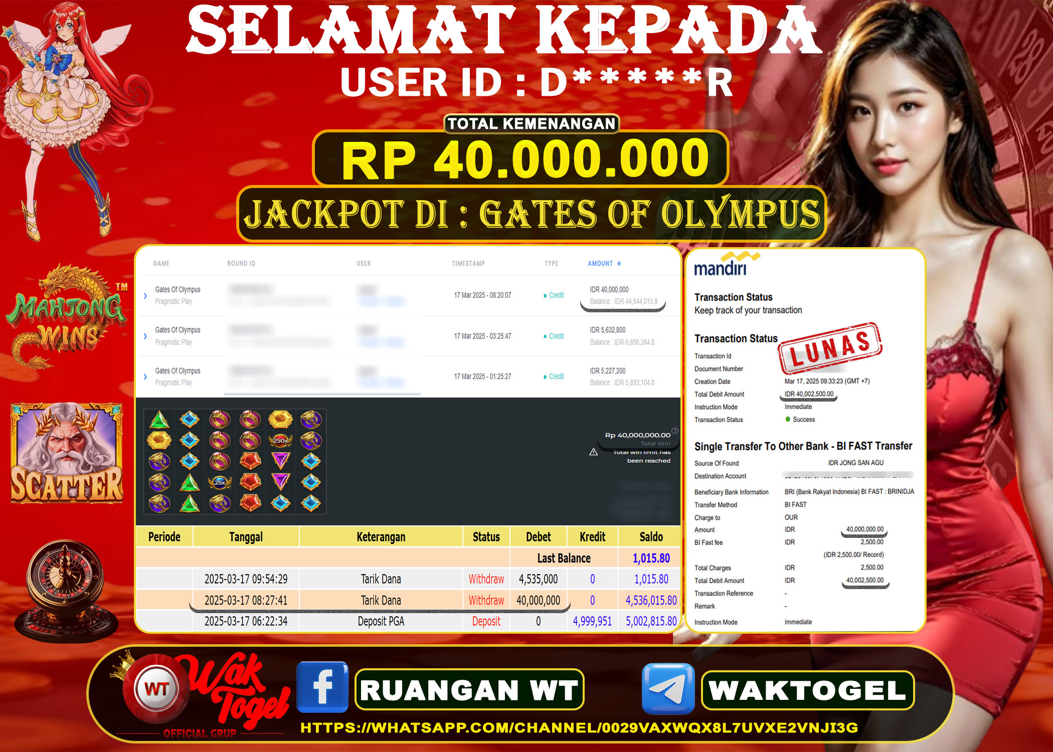JACKPOT SLOT WAKTOGEL BUKTI PEMBAYARAN SLOT WAKTOGEL By JPWT Februari 20, 2025 0 comments 2 min read BUKTI PEMBAYARAN SLOT WAKTOGEL BUKTI PEMBAYARAN SLOT WAKTOGEL RP. 30,000,000 – GAME : SLOT GATES OF OLYMPUS 1000 (USER ID : D********P) TANGGAL | 20-02-2025| […]