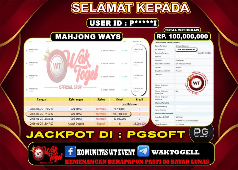 JACKPOT SLOT WAKTOGEL BUKTI PEMBAYARAN SLOT WAKTOGEL By JPWT Januari 25, 2026 0 comments 2 min read BUKTI PEMBAYARAN SLOT WAKTOGEL BUKTI PEMBAYARAN SLOT WAKTOGEL RP. 100,000,000 – GAME : SLOT MAHJONG WAYS (USER ID : P*****I TANGGAL |25-01-2026| CASH LUNAS ! […]