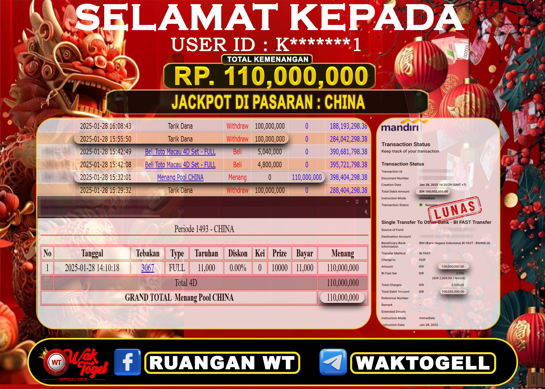 BUKTI PEMBAYARAN CHINA WAKTOGEL BUKTI PEMBAYARAN CHINA WAKTOGEL RP. 110,000,000 – GAME : TOGEL CHINA POOLS (USER ID : K*******1) TANGGAL |28-01-2025| CASH LUNAS ! […]
