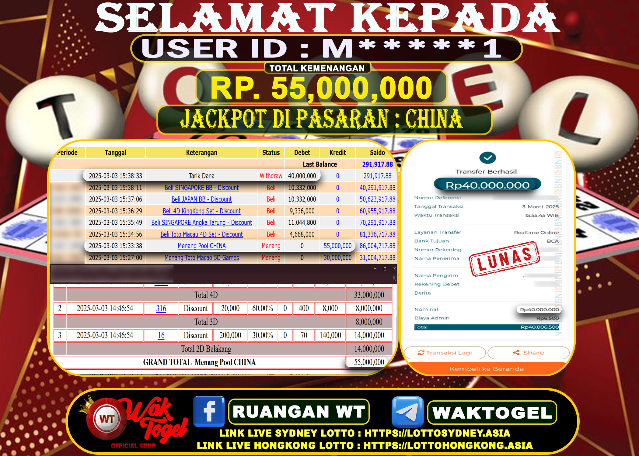 BUKTI PEMBAYARAN CHINA WAKTOGEL BUKTI PEMBAYARAN CHINA WAKTOGEL RP. 55,000,000 – GAME : TOGEL CHINA POOLS (USER ID : M*****1) TANGGAL |03-03-2025| CASH LUNAS ! […]
