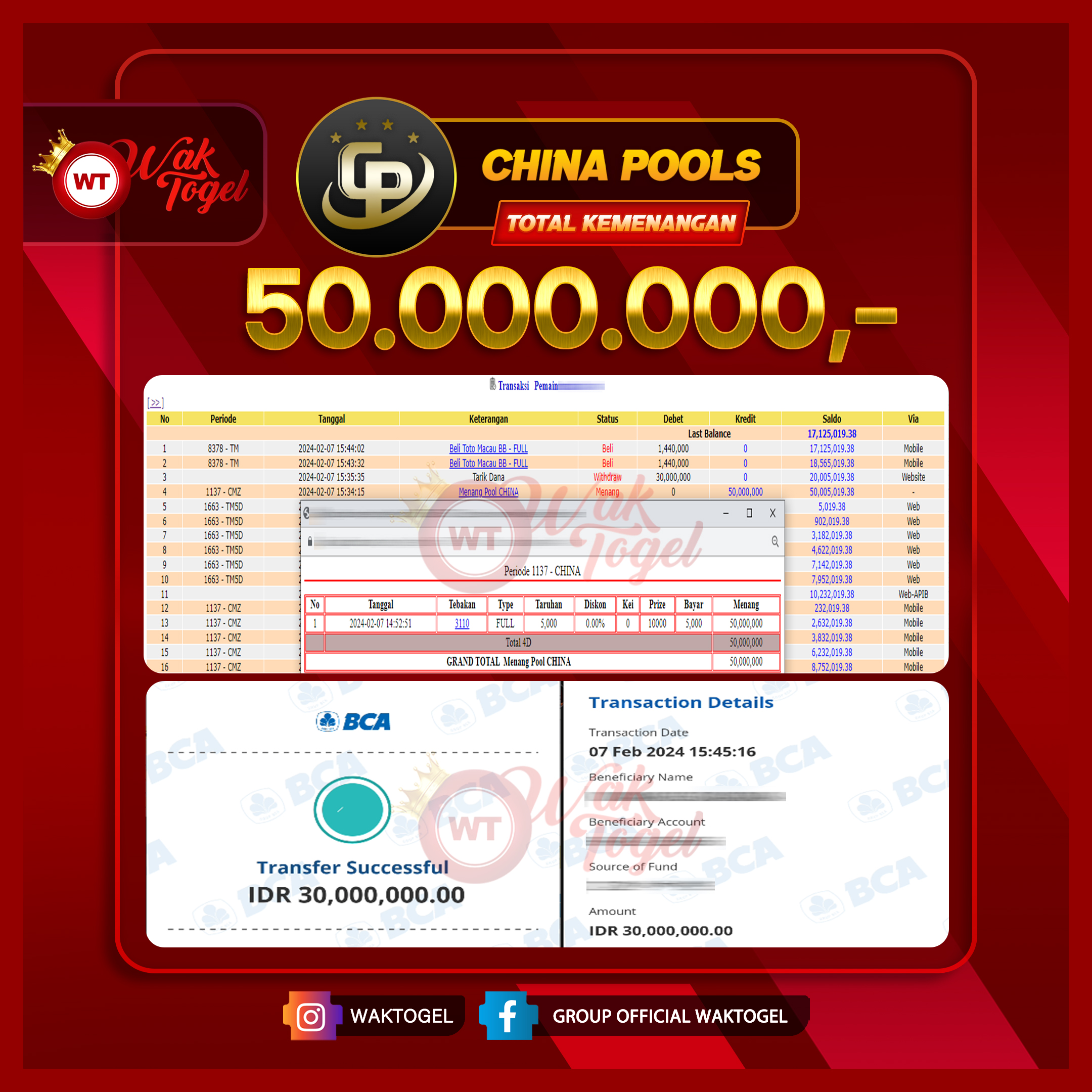 BUKTI PEMBAYARAN CHINA WAKTOGEL BUKTI PEMBAYARAN CHINA WAKTOGEL RP. 50.000.000 – GAME : TOGEL CHINA POOLS TANGGAL (USER ID : K*****1) |07-02-2024| CASH LUNAS ! […]