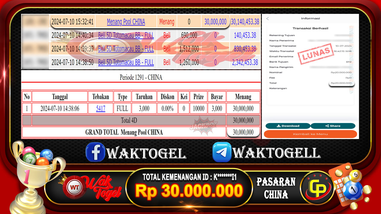 BUKTI PEMBAYARAN CHINA WAKTOGEL BUKTI PEMBAYARAN CHINA WAKTOGEL RP. 30.000.000 – GAME : TOGEL CHINA POOLSÂ (USER ID : K******I1) TANGGAL |10-07-2024| CASH LUNAS ! […]